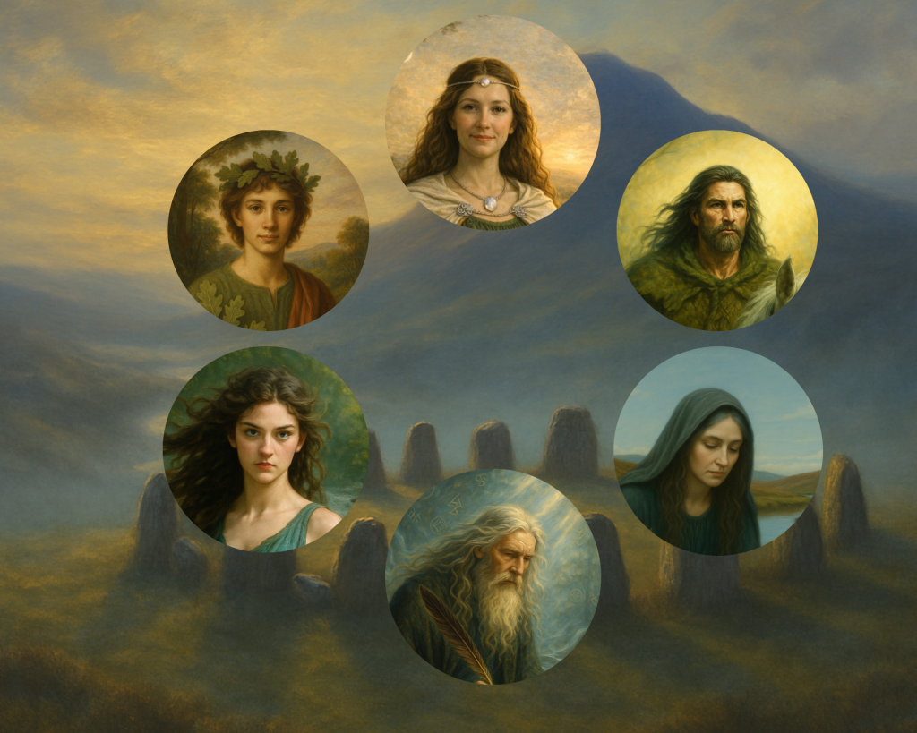 Behold the circle. Six Guardians, woven from myth, land, and liminality, gather at the standing stones. Each bears a gift, a path, a reflection of your soul’s remembering.